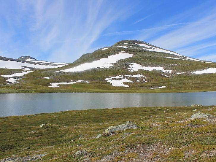 Nå var jeg spent på om fjellbekkene, som hørtes godt på lang avstand, ville by på problemer - særlig med tanke på snøsmeltingen som fortsatt pågikk i fjellet. Men disse var veldig greie å passere. La merke til to personer og en hund som holdt på å rigge seg til på sørsida av vatnet, og litt etter så jeg at et annet par var i ferd med å etablere seg nær vestenden - også disse med hund.
