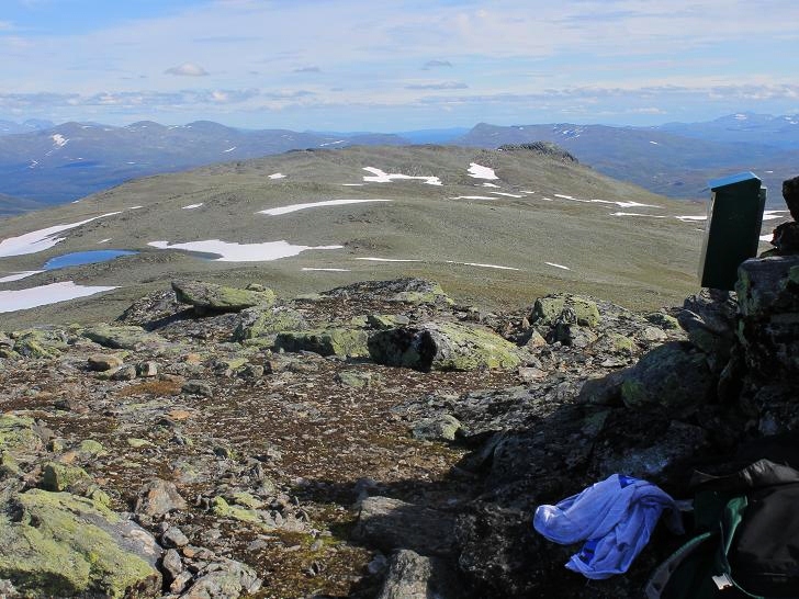 Utsikten var som forventet flott over store deler av Børgefjellet, men det lå fortsatt mye snø igjen. Tok den sedvanlige bilderunden horisonten rundt, før jeg tok en nærmere titt på en postkasse som var satt opp. Jeg antok at det lå ei toppbok av et eller annet slag i den, men der tok jeg feil. Det eneste som lå i postkassen var et refleksbånd!