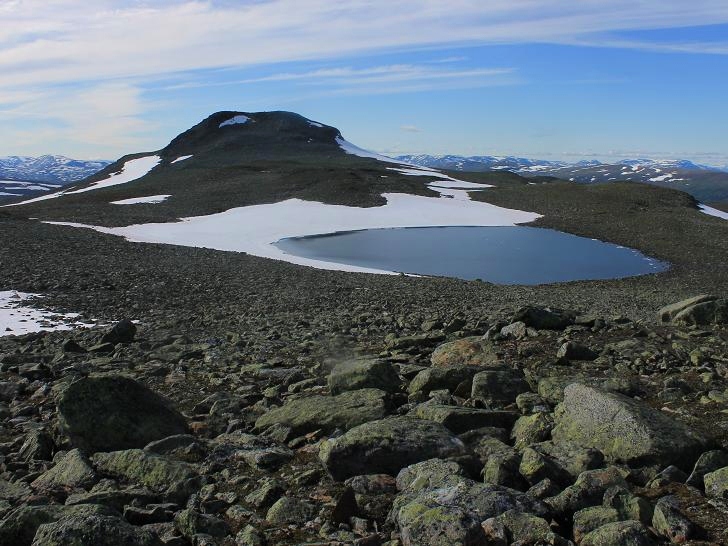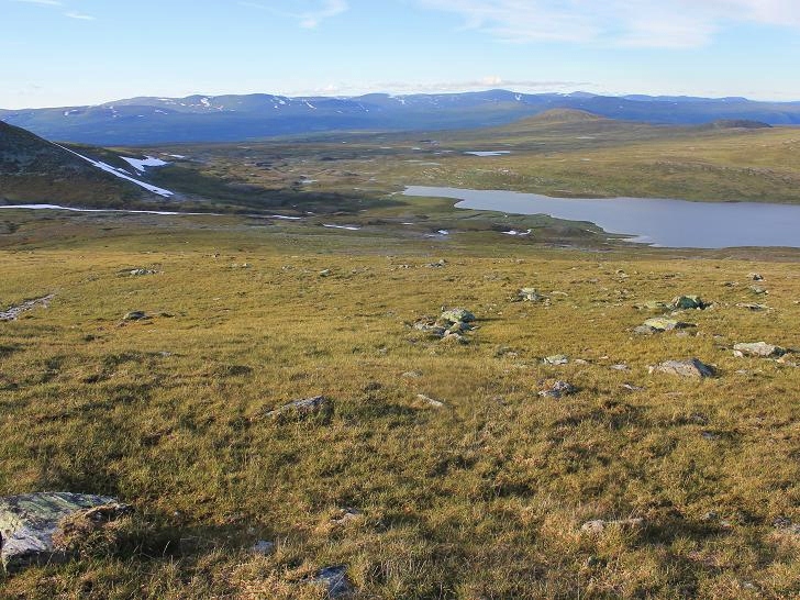 Nå var planen å følge ryggen av Rainesfjellet vel 3,5 km østover mot riksrøys 205A (1371 moh). Etter å ha tatt meg ned fra Rainesklumpen var det bare å gå på! Det var mye stein bortover, men stedvis var det også fint terreng. I tjønn 1312 (ei av Børgefjells høyest beliggende) var det på tide å fylle opp vannflaska. Det var ikke særlig mange bekker å finne, så det gjaldt å benytte seg av de få kildene som tross alt finnes.