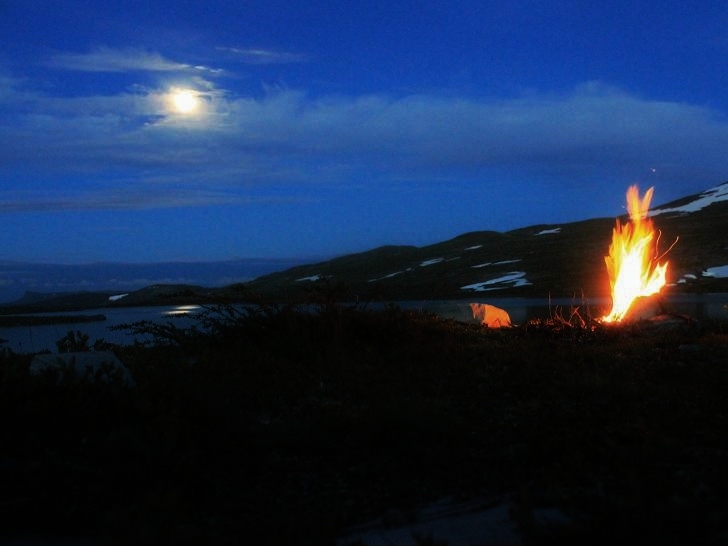 Tilbake i leiren ble det middag, før jeg for ut og sanket tørrved til et kveldsbål. Det var i grunnen ganske enkelt å finne, da det vokste rikelig med vierkratt i området. Ved midnatt tente jeg bålet, som sakte men sikkert flammet opp i den mørke augustnatta. Fullmånen gjemte seg lenge bak omtrent den eneste godværsskyen som var å se på himmelen, men utpå natta lyste den sterkt, og ga gjenskinn i vannflata.