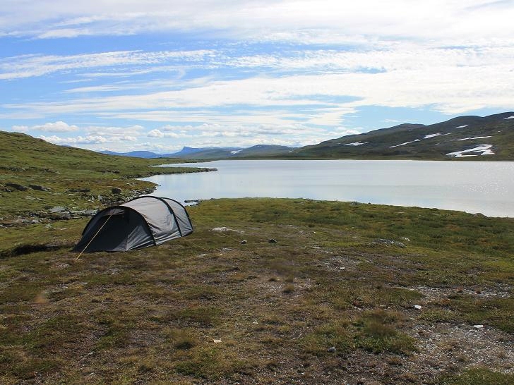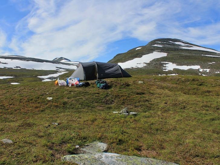 Det fine været så ut til å vedvare, og til slutt ble jeg "tvunget" ut av teltet av heten der inne. Men med godværet var også fluene ankommet, kunne jeg konstatere. Etter diverse gjøremål, så som vannhenting, matlaging, reingjøring osv. var jeg klar til å ta fatt på hjemturen i halv to-tida. Fiskerne holdt til på sørsida av vatnet, idet jeg tok meg oppover bakkene og ut av nasjonalparken.