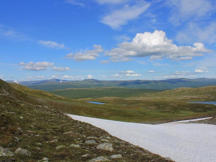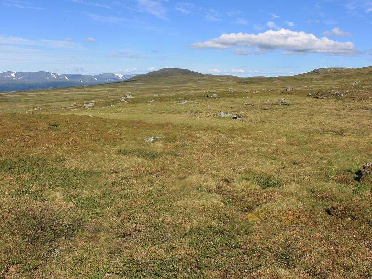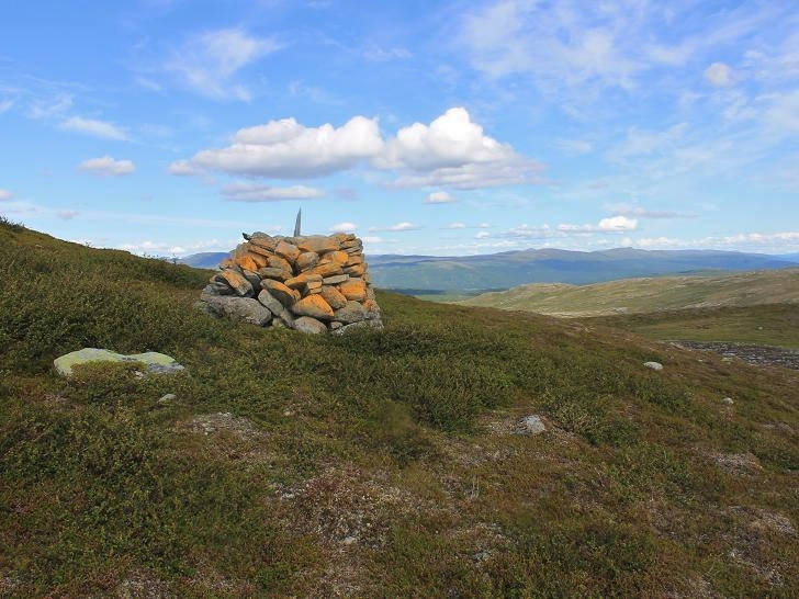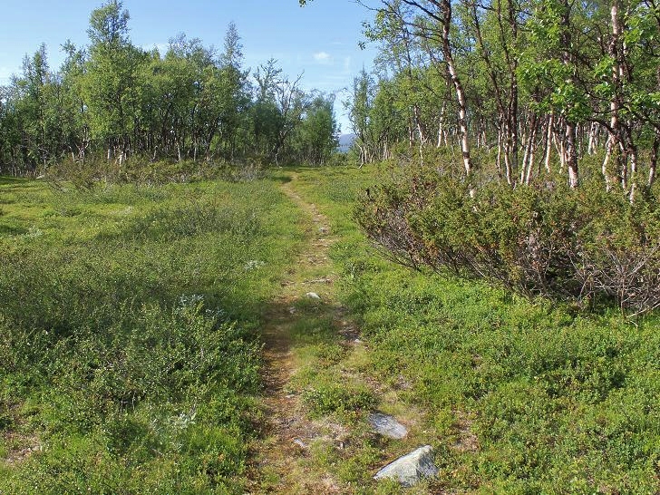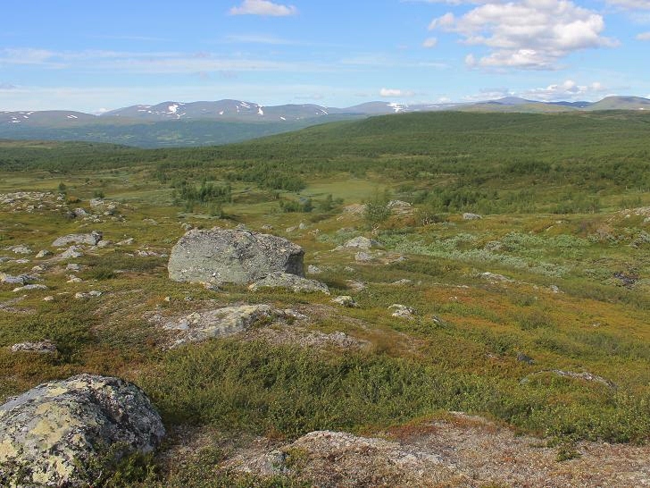 Fjerne fjell kom til syne i godværet, som f.eks. Geittinden og Kjerringtinden på vestsida av Røssvatnet. Jeg fulgte mer eller mindre riksgrensen nordover mot det høyeste punktet, og videre nedover mot bjørkeskogen. Kleggen og "blindingen" var til tider nokså innpåslitne. I det fjerne, langt foran meg, kunne jeg se den uthogde grensegata, og jeg skimtet til og med fjellstua Åtnikstugan.