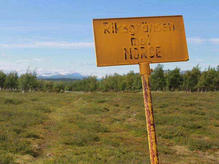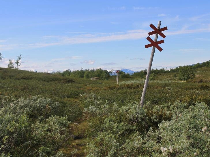 På grensen var det satt opp noen skilt, bl.a. et som viste vei mot Klimpfjäll i Sverige. Et annet skilt informerte meg om at jeg nå fulgte den såkalte Norgefararleden, en eldgammel ferdselsåre mellom fjellbygdene i Sverige og Norge. Som med veiene, ble også stien jeg fulgte av lavere kvalitet da jeg gikk inn i Norge, og den gode merkingen opphørte. Det gikk likevel stort sett greit å holde stien, med unntak av et par tilfeller da jeg mistet den.