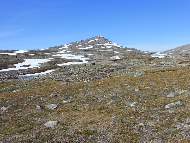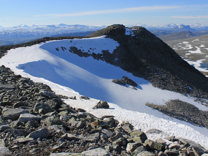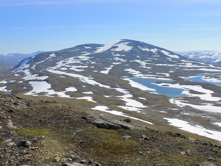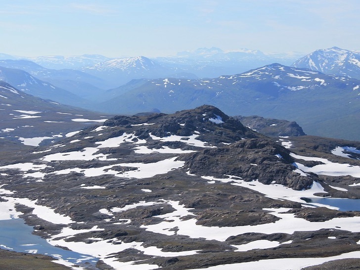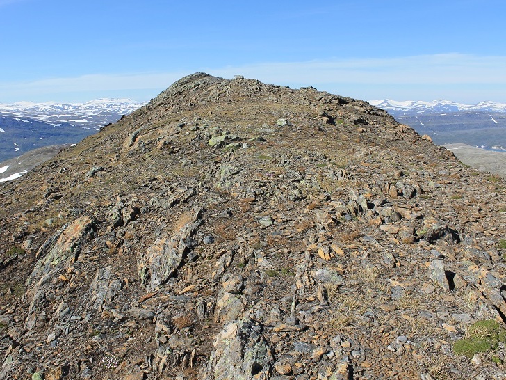 En knøttliten varde møtte meg på toppen av Ruovddevárre (1294 moh.). I finværet hadde jeg en strålende utsikt i alle retninger, fra Okstindan i sør til Børvasstindan i nord. I sør ruvet det over 1500 m høye Semskfjellet, mens jeg i nord hadde den nesten like høye Lønstinden, som jeg også hadde et håp om å bestige. Jeg så dessuten søre Bjøllåvatnet, der jeg hadde teltleir i 2011. For øvrig var dette kun min andre lengre tur i Saltfjellet. Til sammenligning har jeg 13 langturer i Børgefjellet på baken.