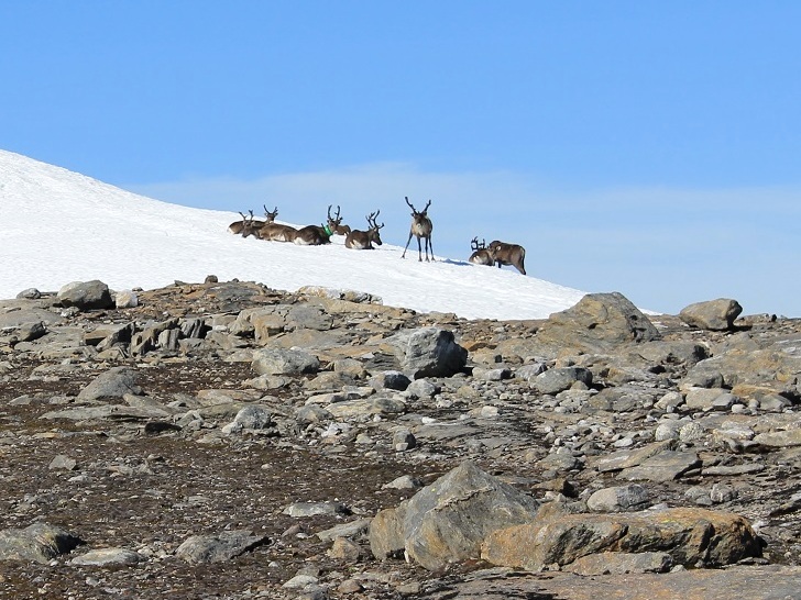 Jeg begav meg vestover langs den T-merkede stien, som passerte like ovenfor teltplassen, før jeg tok av og fulgte ryggen oppover Ruovddevárre. Terrenget var fint hele veien oppover. Rumpetaska - som svært sjelden er med på tur - var fin å ha. Kun ei drikkeflaske og en pakke havrekjeks hadde jeg med meg, i tillegg til kamerabagen. Solkrem hadde jeg imidlertid ikke greid å få med meg til Saltfjellet. På ei snøfonn skremmer jeg plutselig opp en flokk rein, før de springer i skjul.