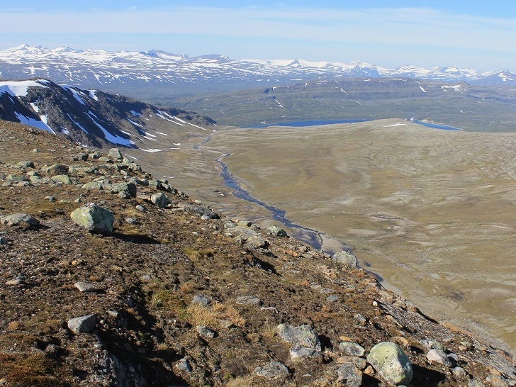 Utsikt fra Ruovddevárre mot sør. Den langstrakte Bjøllådalen kan fornemmes med Okstindan i det fjerne.