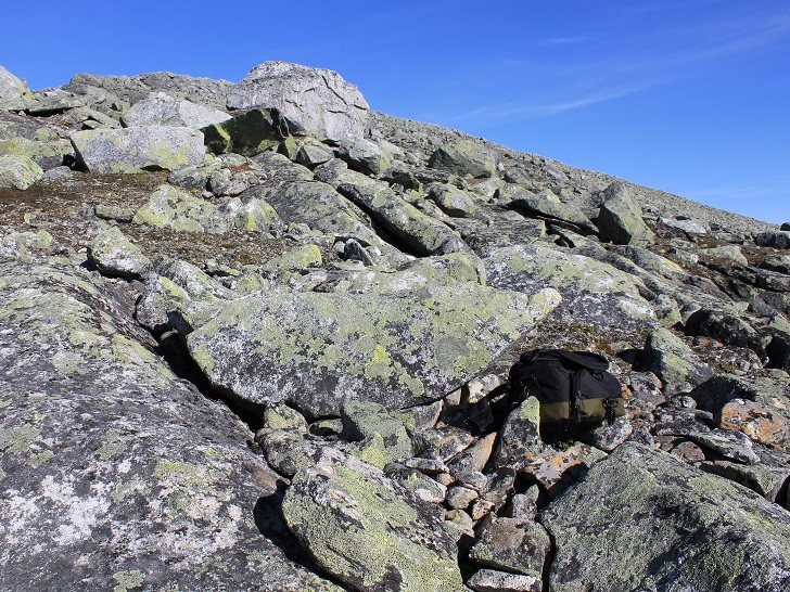 Med ett oppdager jeg at kamerabagen er borte! Jeg må ha satt den fra meg i steinura et sted, under en drikkepause. Fortvilelsen er til å ta og føle på. Å finne igjen den lille bagen i den enorme steinura er vel som å finne den berømte nåla i høystakken - tilnærmet umulig! Jeg bestemmer meg uansett for å bestige Lønstinden, og heller prøve å lete etter kamerabagen på tur nedover. Tanken om å fortsette til Semskdalen allerede i ettermiddag er forresten bare å glemme, innser jeg.
