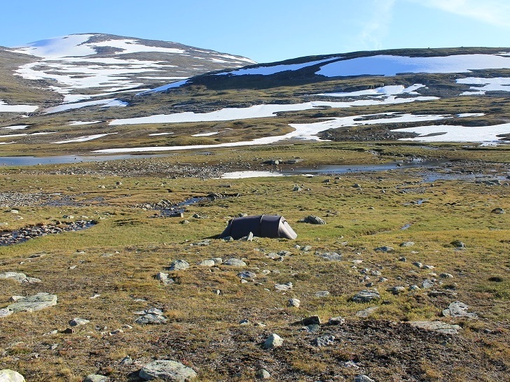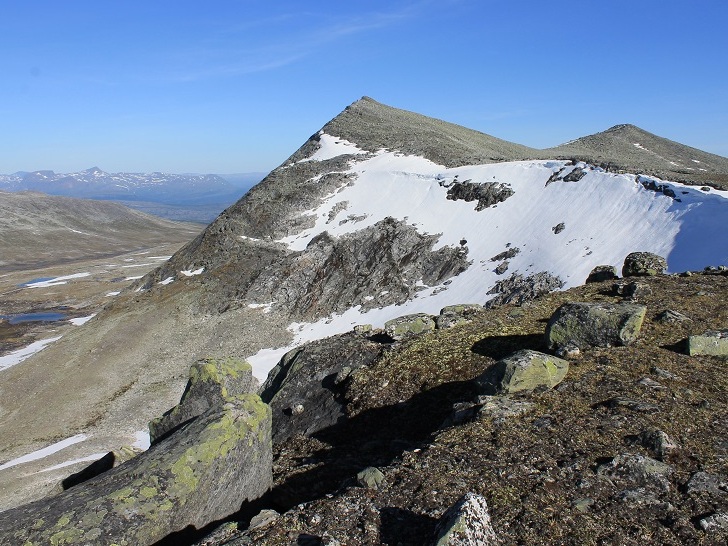 Det var herlig å stå opp til et fjellandskap badet i sol. Planen for dagen var først å bestige Ruovddevárre, en langstrakt rygg vest for teltplassen, for deretter å ta meg til topps på den navnløse topp 1376 og Lønstinden. Litt seinere på dagen ville jeg bryte leir og legge i vei sørover mot Semskdalen.