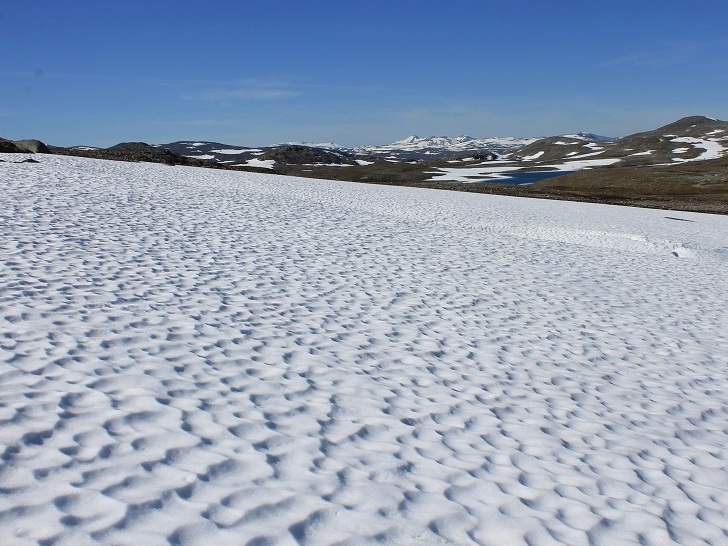 Ikke overraskende lå det snø helt ned i vannkanten på de to Semskvatnan på drøyt 1000 moh. Jeg nærmet meg nå Semskfjellets vestrygg, og veide litt for og imot om jeg skulle gjøre en bestigning eller ei. I luftlinje var det kun to km til et av Saltfjellets høyeste fjell, men det var også snakk om 500 høydemeter å karre seg opp. Jo nærmere jeg kom, dess mer tiltalende ble tanken. Dessuten så fjellsida medgjørlig ut. På en godt synlig haug parkerte jeg storsekken og la i vei oppover Semskfjellet.