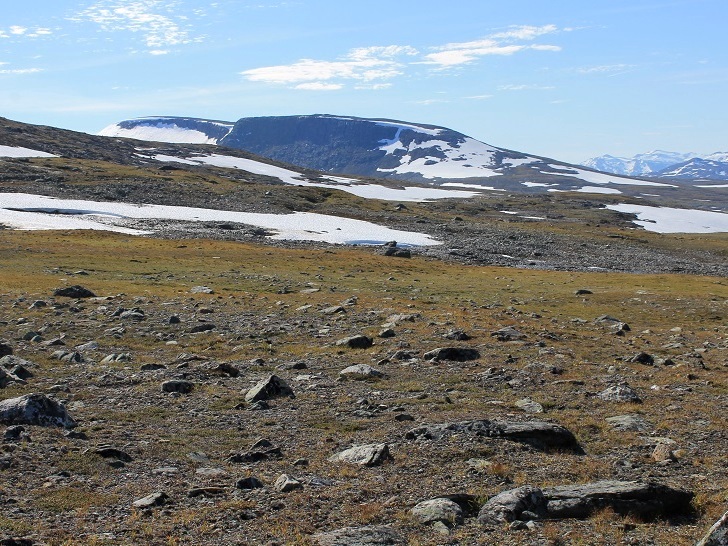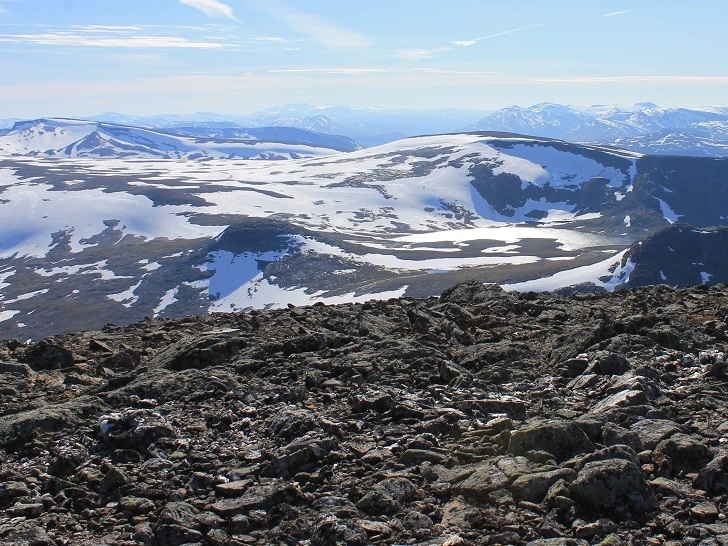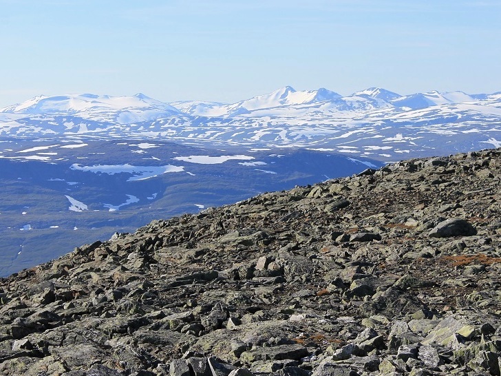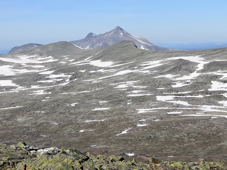 Med god lufting var det overraskende komfortabelt å gå med jakke i solsteiken. Oppe fra dalen dukket det opp fjerne fjell i horisonten foran meg, og bak meg kom Lønstinden til syne, der jeg var i går. Jeg fulgte ingen sti, men holdt meg nært oppunder Semskfjellet som jeg hadde på venstre side.