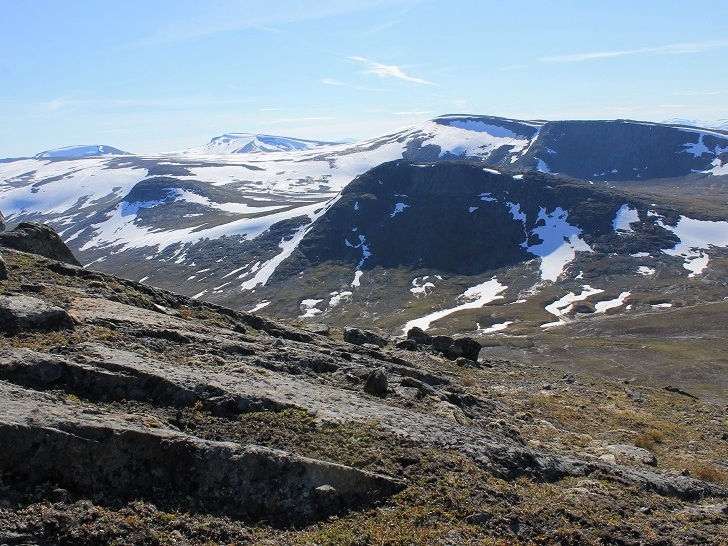Utsikt mot Saltfjellets høyeste topp, Ørfjellet (1751 moh.) i nord.