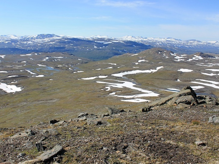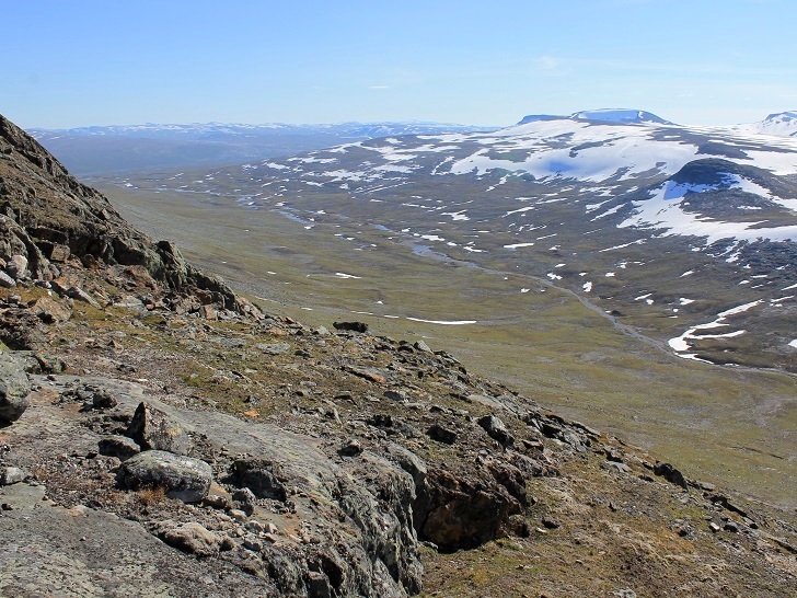 Som forventet gikk det veldig greit oppover fjellsida, og stadig større områder av nasjonalparken ble synlig. Brått får jeg se Semskdalen i hele sin lengde nedenfor meg, på sørsida av fjellet. Jeg prøver å lokalisere en egnet teltplass, og ser meg ut ei tilsynelatende fin slette ved elva, nokså høyt oppe i dalen.