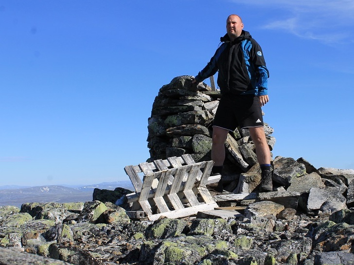 Jeg merket nå at sulten begynte å melde seg. Det var vel straffen for at gårsdagens middagsrester ble nyttet til frokost i stedet for næringsrik havregrøt. Alt jeg hadde med meg til topps var en pakke chili-nøtter. Det var dessuten ikke mange munnfuller igjen på vannflaska. Jeg fikk bare prøve å rasjonere det lille jeg hadde på best mulig måte. På vel 1500 meters høyde tok det fine terrenget slutt og det ble steinur å gå i. Heldigvis var ura av den snille sorten, og et stykke foran meg fikk jeg øye på toppvarden.