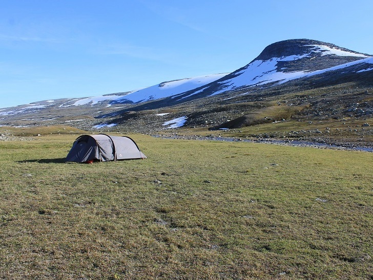 Vel nede igjen var det på med storsekken, før jeg ganske snart bikket ned mot Semskdalen i sør. Jeg var nå gått tom for vann, og ingen bekk var å oppdrive. Derfor var første prioritet å få slukket tørsten og fyllt opp vannflaska. Omsider kom jeg til Semskas bredd og fikk drukket meg utørst. Et kvarter seinere var jeg framme ved gressletta jeg hadde sett meg ut fra Semskfjellet. Den framstod som en stor og flat gressplen, og levde så absolutt opp til forhåpningene. Her ville jeg slå meg til ro.