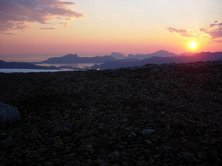 Værnestinden ytterst i Tjongsfjorden og Rødøyløva som slumrer i midnattssola.