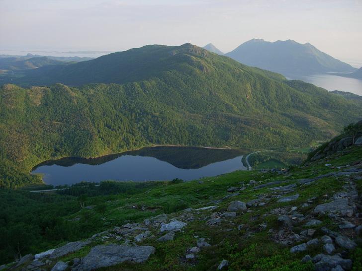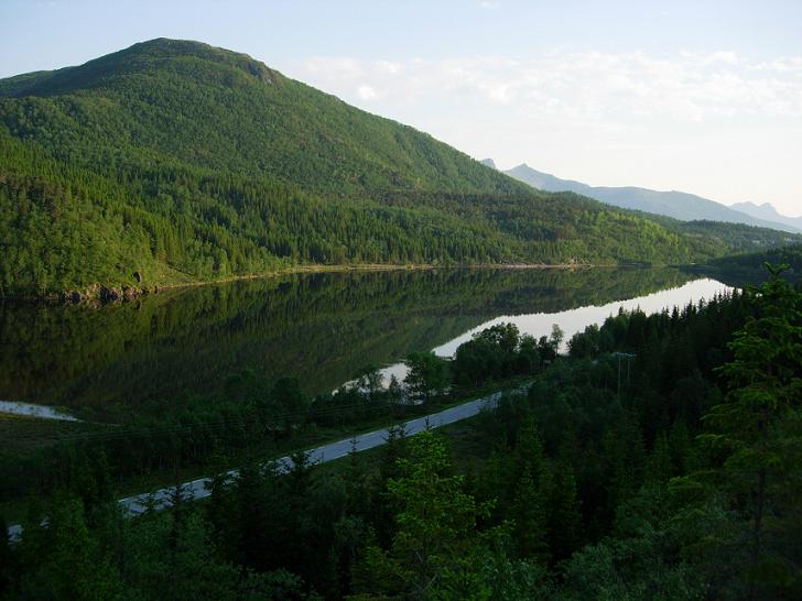 Nedover den skogbevokste lia mot kystriksveien kom jeg atter en gang bort fra stien, og det ble en nokså uryddig ferd nedover. Kom ned ved sørenden av Ågvatnet, like ved grensen mot Meløy kommune. Nå var det bare å innstille seg på å slite asfalten ei stund.
