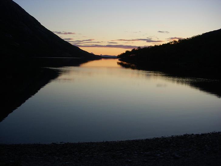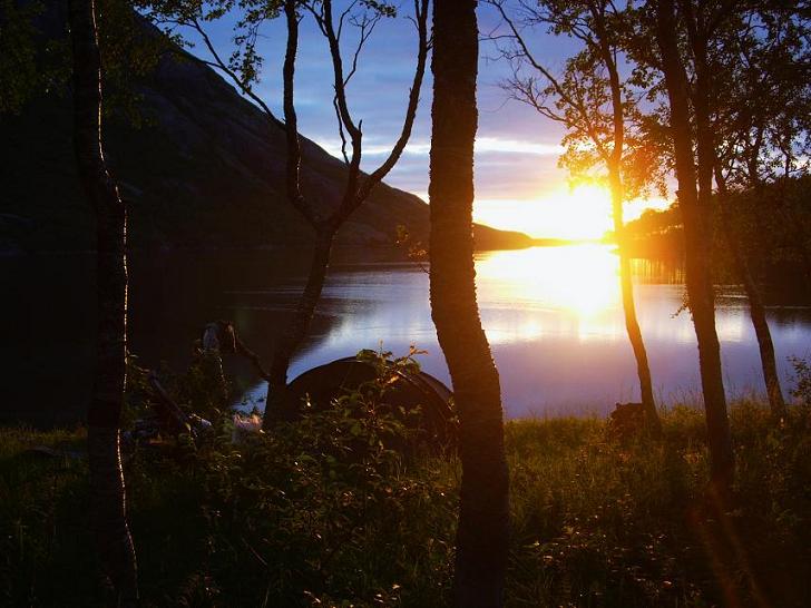 Natta ble veldig vakker, og ikke et vindpust var å anspore. Åselivatnet lå som et speil foran oss. I horisonten - i enden av Åselidalen - så vi tindene på Landegode. Fra selve bålplassen var det kun Navaren (632 moh) som var synlig, men gikk vi noen skritt langs stranda dukket også de øvrige tindene på øya opp. Rett over oss ruvet den over 1000 m høye Børtinden.