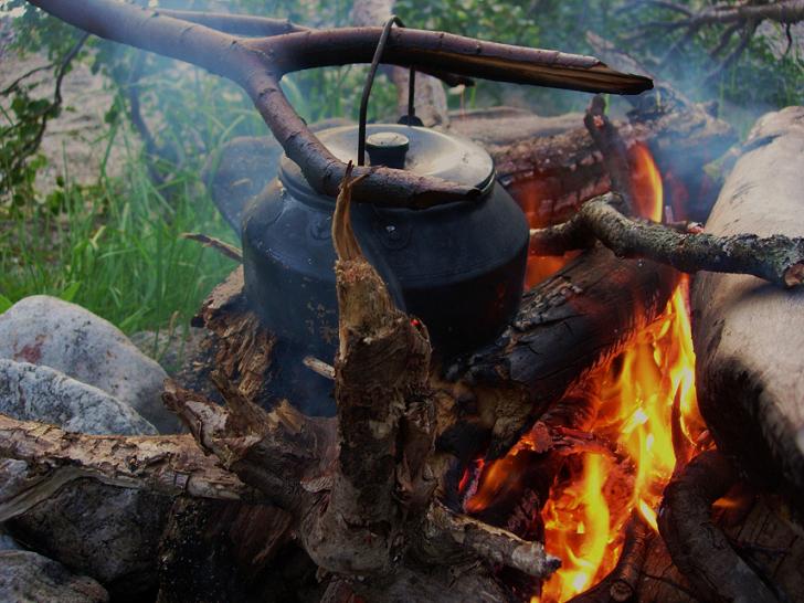 Lettet setter vi oss ved bålet igjen, som endelig begynner å ta seg opp. Nå er det jammen meg på tide med kaffe! Men i det jeg skal løfte til side den "overfylte" kaffekjelen, da vatnet er i ferd med å koke, skjer det! Jeg mister kontrollen over kjelen, men klarer likefullt med et formidabelt presisjonsnivå å velte alt vatnet over flammene - slik at det gjenstridige bålet vårt slukker fullstendig! Kaffe ble det - men vha gassapparat. Bålet tok seg for øvrig opp igjen, utrolig nok.
