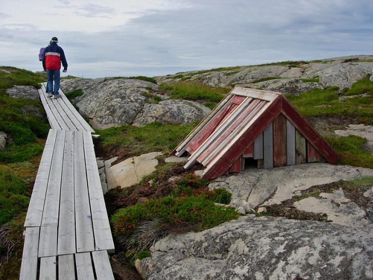 På en vegg var det montert ei info-tavle som belyste litt av Bremsteins historie, og jeg tok en titt på denne - en fin start på vandringen. På dette utværet var det fast bosetting fram til 1923, da den siste familien flyttet til Vega. Foruten de viktige fiskeriene dyrket folket bygg og havre og satte potet. Det har for øvrig vært anløp av lokalbåt, fiskemottak, trandamperi, ishus, brevhus, poståpneri og bedehus her.