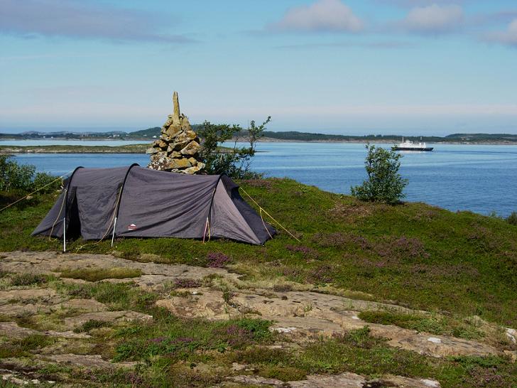 Vel framme ved fergeleiet var det ingen andre å se, så jeg ringte mannskapet på ferga for å få dem til å legge til. Dette hadde jeg strengt tatt ikke behøvd, da den ene bilen etter den andre kom. Jeg kom i prat med en MC-sjåfør fra Sandnessjøen som hadde hytte her. Det viste seg at han hadde sett teltet mitt fra hytta si. Ferga kom, og omsider kunne jeg gå i land på Tjøtta - rødere i trynet enn Rødøyfjellet. Det ble for øvrig konsumert formidable mengder forfriskninger, før jeg satte meg bak rattet.
