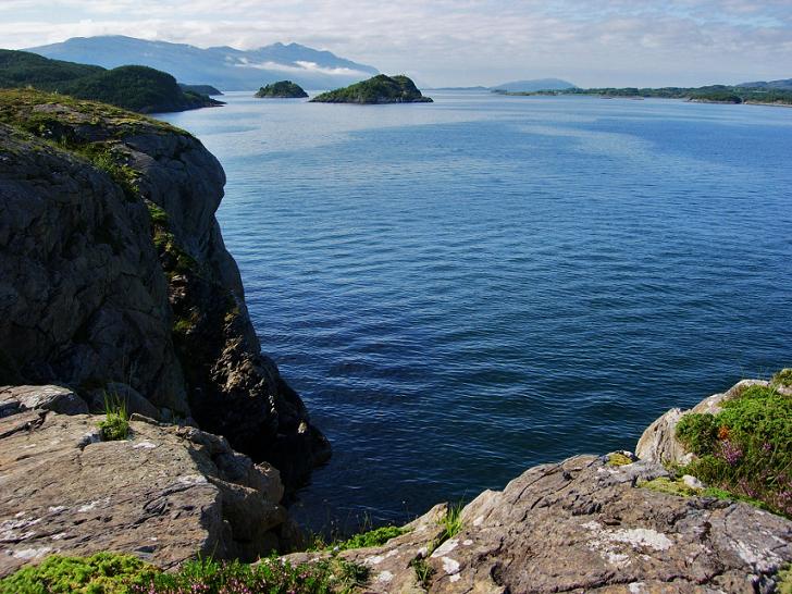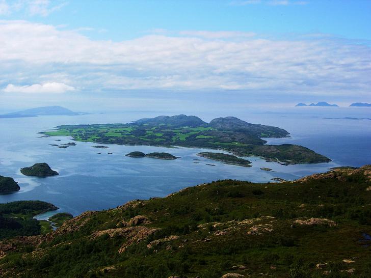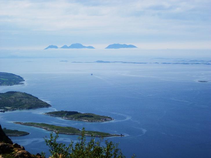 Sørover var det en nydelig utsikt mot øyer som Mindlandet, Hamnøya og Vega. Fjellene på sistnevnte øy stakk opp av skodda som lå ved havnivå der ute. I vest og i nord tok Tjøtta og Alsta med De syv søstre mye av oppmerksomheten, samt småøyene Haltøya og Bærøya, like nord for Rødøya. Mot øst så jeg rett innover Halsfjorden og litt av fjordarmen Grytåfjorden.