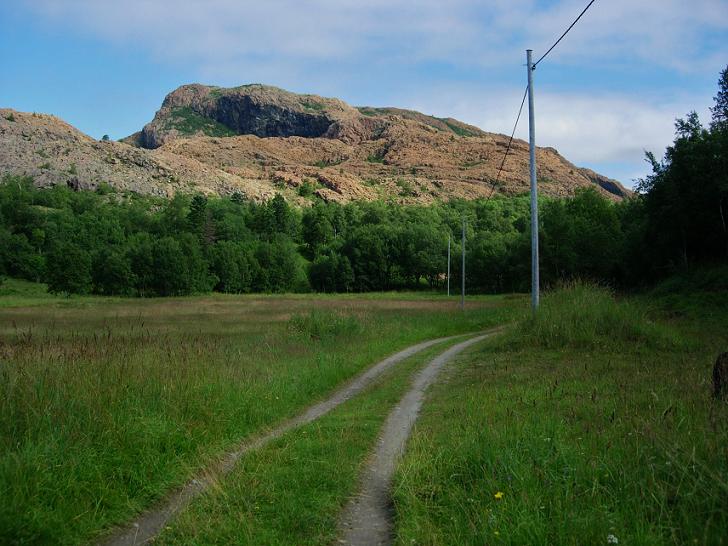 Som forventet våknet jeg opp til godvær - noe som var ensbetydende med topptur til det drøyt 300 m høye Rødøyfjellet. Etter frokost tok jeg på meg en lett sekk og la i vei langs grusveien. Traff på ei dame som forklarte hvor jeg burde ta av fra veien. Ved Rødøygården måtte jeg først over et jorde, så gjennom ei grind. Videre var det lett å følge den merkede løypa oppover. Tipset viste seg å stemme.