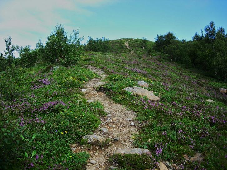 Fra sommerhusene på Tangen følges en lettgått sti langs Rødøyfjellet tilbake.