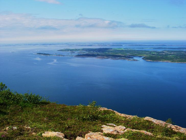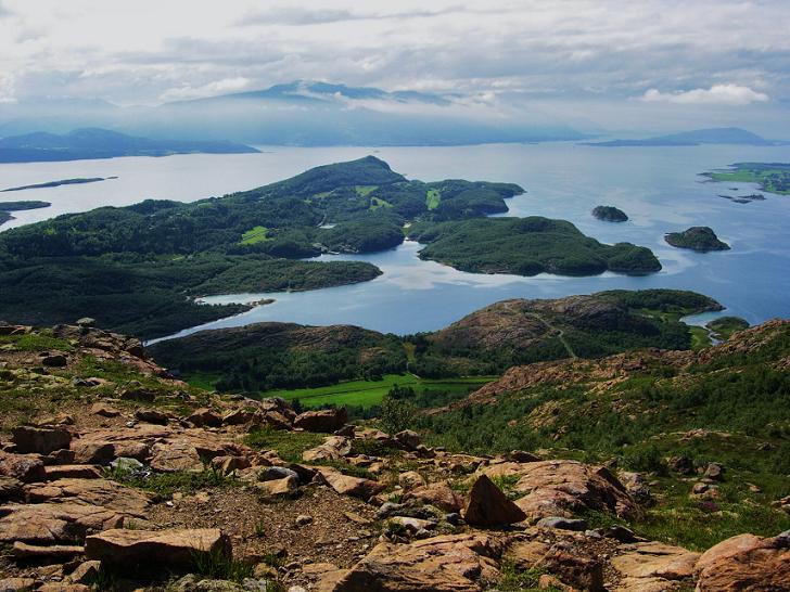 Jeg vil fortsette over toppen, og ned på nordsida. Utsikt mot bl.a. Haltøya og Bærøya.