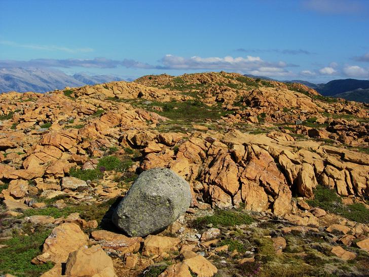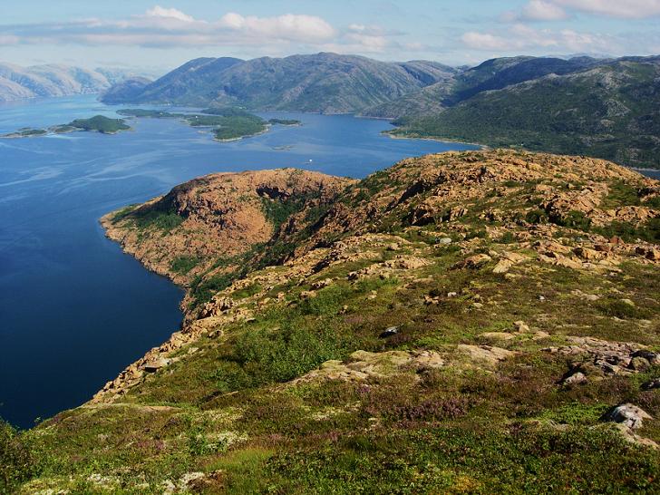 Det var et temmelig spesielt fjell å ta seg oppover, med sin rødaktige farge, og landskapet var ikke helt ulikt det man finner i gamle western-filmer. Men utsikten, som snart begynte å gjøre seg gjeldende, avslørte at jeg befant meg i Nordland og ikke i ville vesten. Fjellet viste seg lettgått, og merkingen var dessuten god. Etter hvert ble det røde fjellet avløst av gress og annen vegetasjon, og en tydelig sti kom til syne.