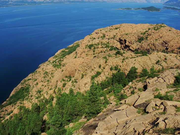 La merke til at det var folk på toppen - eller rettere sagt på et utsiktspunkt, der den merkede stien slutter. Selve toppen ligger noen hundre m lenger nord. Det var to damer og en mann som hadde tatt turen opp, og mens damene tok fatt på nedturen ble jeg stående og pratte med mannen. Det viste seg at han var her fra øya, og at han hadde gode kunnskaper om øyas fornminner. Bl.a. opplyste han meg om at det hadde blitt gjort et funn av et skip med en mann ombord, og om hulemalerier på ei naboøy.