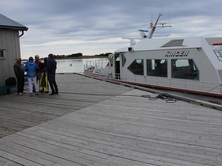 Etter en ganske lang kjøretur, samt ferge til Vega, var vi framme på Nes i god tid før avgang. Med meg hadde jeg mine etter hvert tilårskomne foreldre. Pappa er de siste årene blitt så dårlig til beins at denne typen turer omtrent er det eneste som er realistisk å få til i lag med ham. Før vi ankom Nes, nord på Vega, hadde vi vært innom turistkontoret på Gladstad og hentet billettene, og etter litt venting kunne de elleve påmeldte deltakerne gå om bord i Kingen, som skulle frakte oss ut i skjærgården.