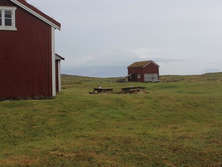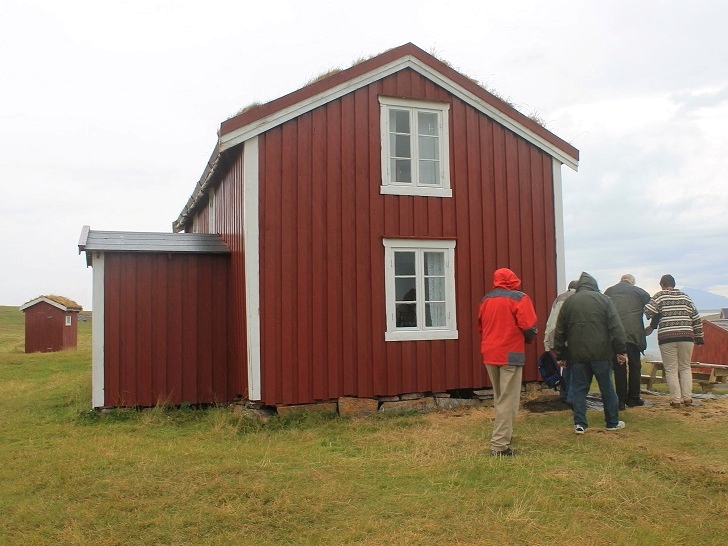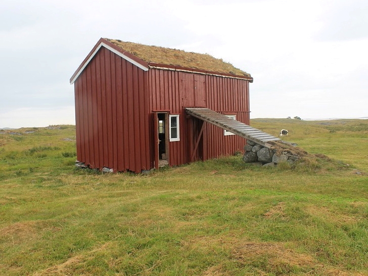 Vi gikk så videre over gressletta mot bolighuset - ei rødmalt lån med gress på taket, som på 1800-tallet stod i Velfjord. Etter at huset var revet, ble materialene slept med robåt ut fjorden og helt til Emårsøy, der huset ble satt opp igjen i 1885. Da Emårsøya ble fraflyttet i 1957, ble fjøs og naust revet og bolighuset forfalt. Dagens fjøs ble hentet fra Vega for noen år siden, og satt opp på den opprinnelige fjøstomta, mens bolighuset ble gjenstand for omfattende restaurering (kilde: info-tavla på Emårsøy).