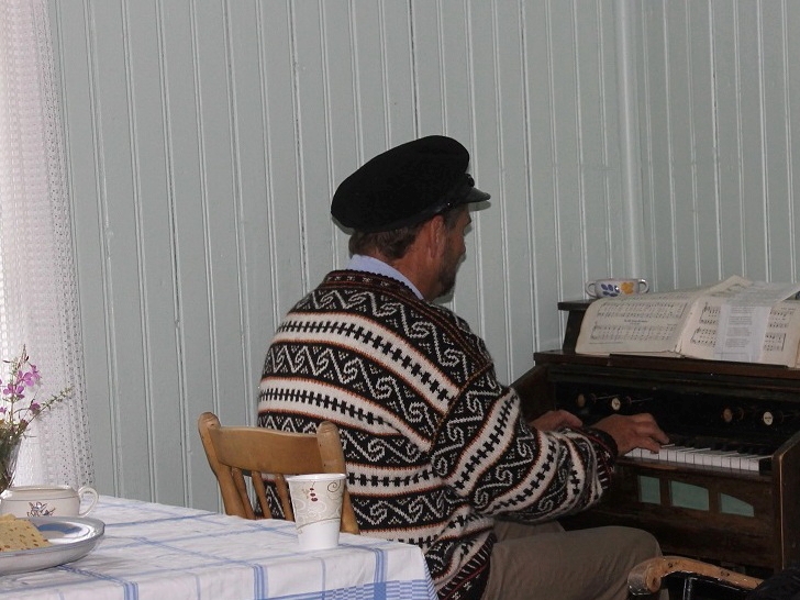Vel inne i stua ble vi servert rykende varm kaffe og nydelig "veglefse" fra Kjul, før Gisle på nytt fremførte en trall. Det ble etter hvert flere, både med og uten akkompagnement. Vi ble fortalt at dette var gamle skillingsviser av visedikteren og sangeren Emelius Kvalholm (1892 - 1970) fra Kvalholmen, like nord for Vega. Visene tar for seg livet ute i øyan, slik det en gang var, og det er mye livsvisdom - på godt og vondt - som trer fram i tekstene.