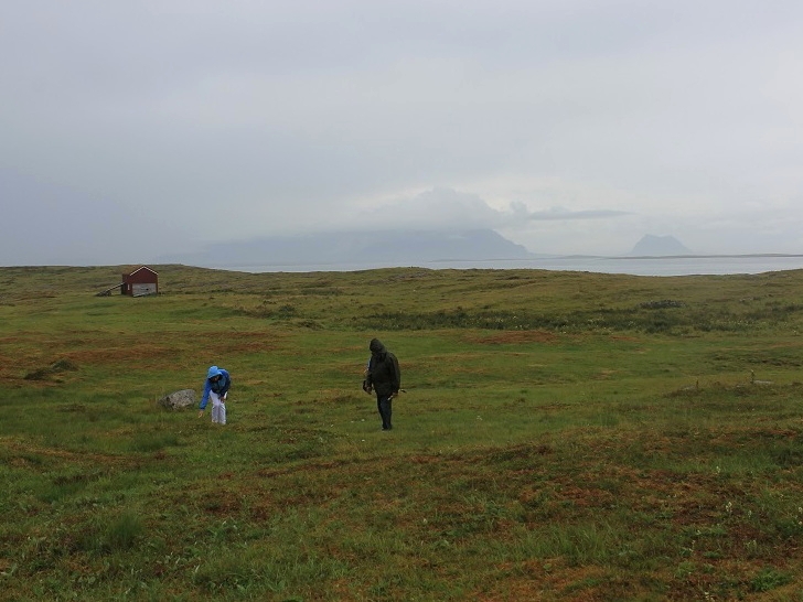 Været bedret seg noe, og vi gikk ut igjen. Det bar i rolig tempo oppover mot øyas høyeste punkt, som ikke er mer enn noen få meter over havnivå. Utsikten er nok formidabel herfra i godt vær, men i det gråværet som hersket i dag, var det så vidt mulig å skimte Vegfjellene og Søla i sør.