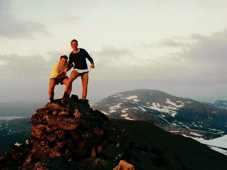 To glade gutter på toppen av Brurskanken. Jørn (t.v.) og Jan. I bakgrunnen ses Geittinden (1556 moh.).