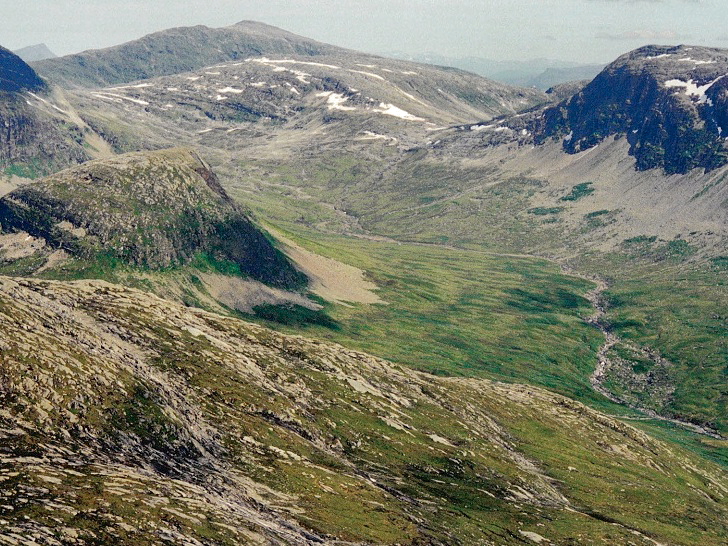 Utsikt mot Geittindskardet og fjell som Geitungen og Kjerringtinden. Oppe til venstre skimtes Hjartfjelltinden.