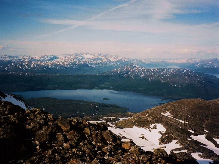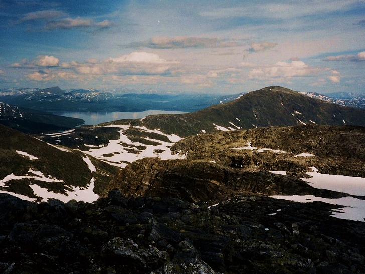Sakte, men sikkert tok vi oss oppover snøbreene i forsenkningen mellom sørryggen av Geittinden (som vi hadde på vår venstre side) og fjelltoppen Åerjie Gaajsåelkie. På ca 1250 meters høyde fikk vi med ett fri utsikt mot nord. Herfra fulgte vi Geittindens østrygg helt til topps – fremdeles i bar overkropp.