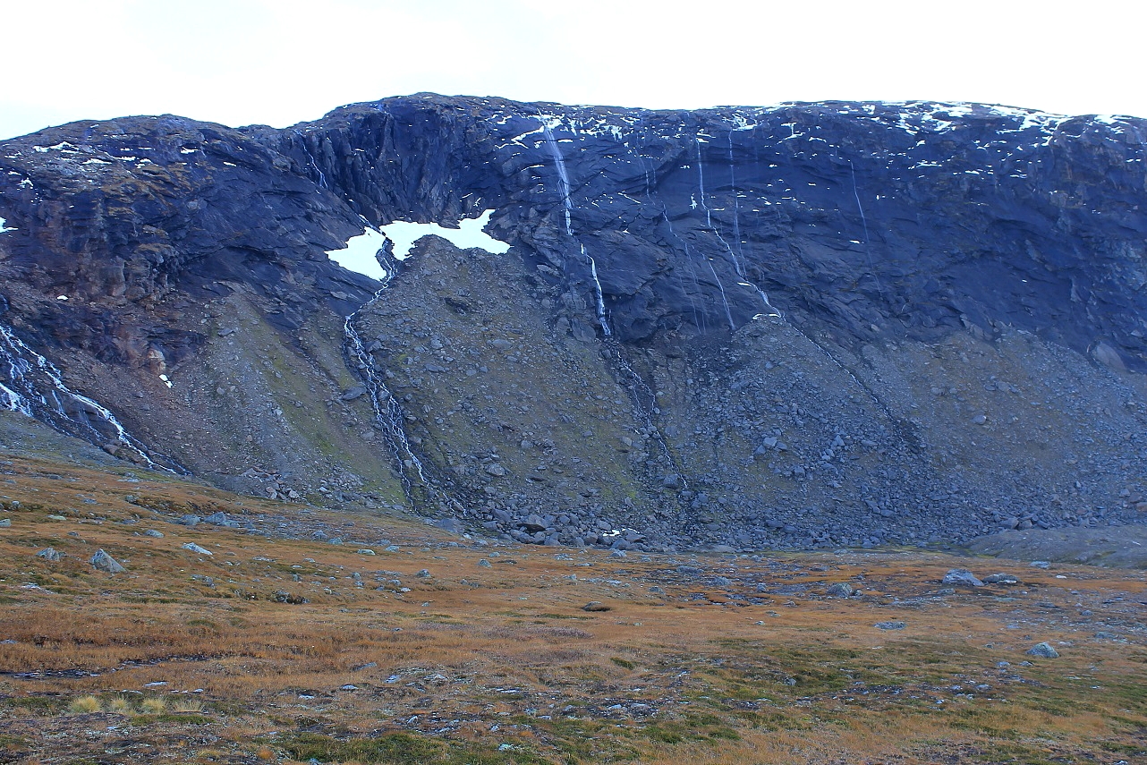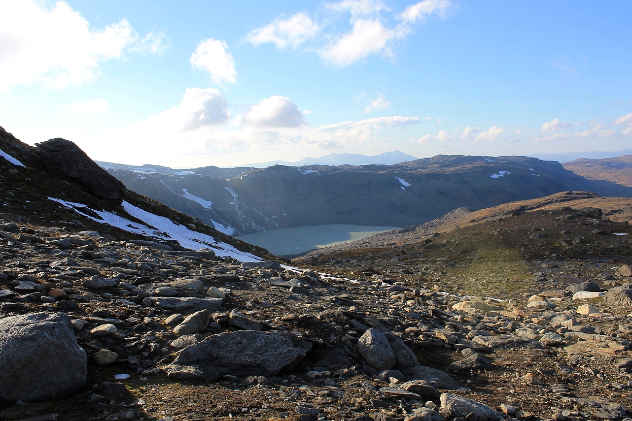 Det var fortsatt en del folk å treffe videre innover fjellet. Jeg ble stoppet av ei sprek dame, som kunne fortelle meg at “du får det tøft oppover!” Videre sier hun at det hadde blitt målt en vindstyrke på 28 sekundmeter oppe ved Rabothytta, da hun gikk der fra, noe som også andre jeg møtte på kunne bekrefte. Ifølge Beauforts vindskala tilsvarer 28 m/sek full storm – nesten på grensen til sterk storm! Videre står det at ved full storm rykkes trær opp med rot, og forårsaker store bygningsskader.
