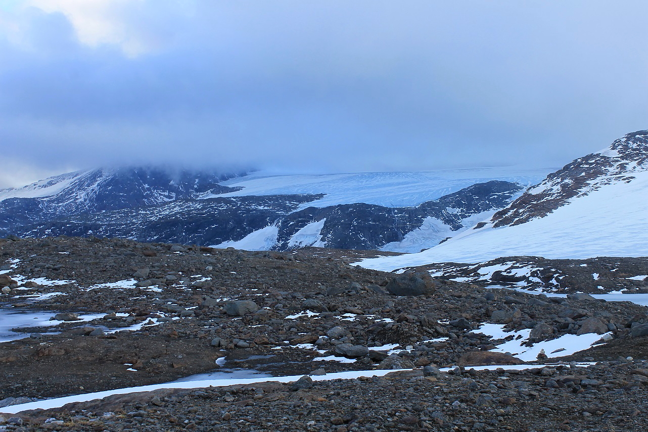 Okstindan var dessverre ikke synlig i dag, men jeg kan tenke meg at det er et flott syn å beskue de ruvende tindene herfra. På den annen side var det også en givende opplevelse å bli utsatt for værgudenes harme i dag.