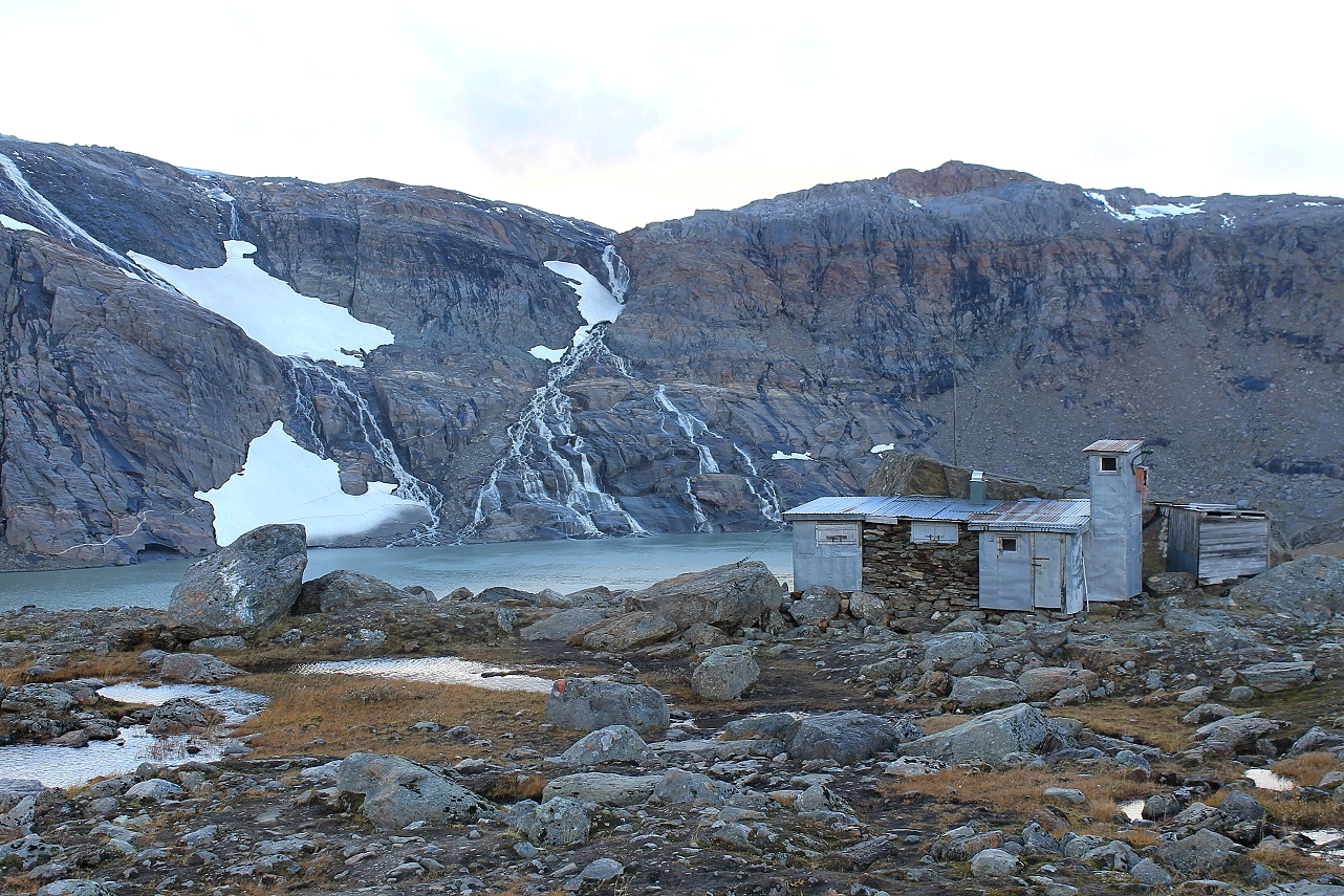 På vei nedover blåste det fortsatt meget friskt, men på langt nær like kraftig som på den strabasiøse veien opp. Slentret meg nedover mot Steinbua, som jeg nå valgte å stikke nesen innom. Det var akkurat like trangt og kummerlig som jeg husket det. Steinbua er å anse som ei nødbu, og står som en grell kontrast til den ekstravagante Rabothytta til ti millioner kroner. Men når det er sagt, så er Steinbua ei hytte med sjel – for de av oss som vet å verdsette slikt noe. Etter å ha signert hytteboka fortsatte jeg.
