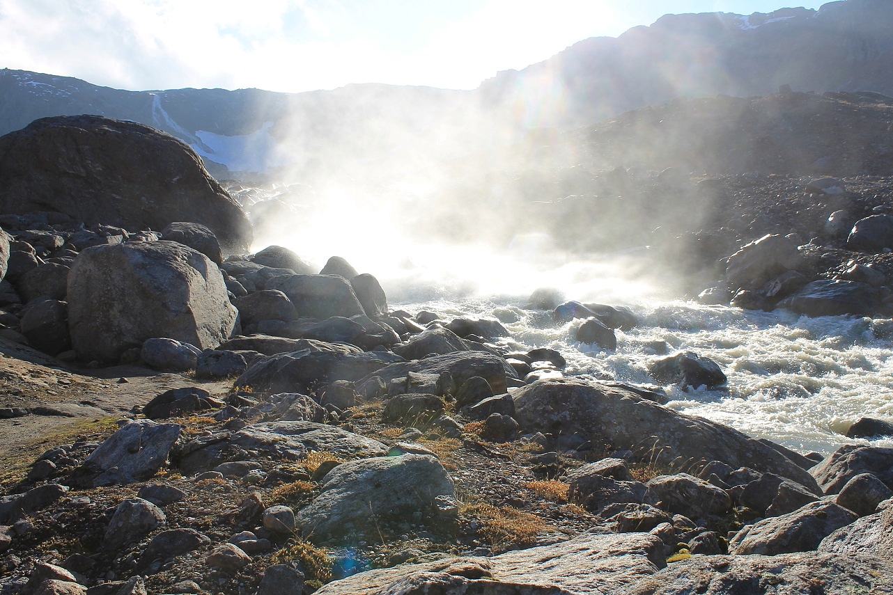 Framme ved Mørkbekktjønna blåste det noe helt infernalsk, og flere vindroser kom feiende over vannflata i vill fart. Det var dessuten betydelig bølgeaktivitet i den lille tjønna. En ting jeg ble veldig overrasket over, var at den store og oppsprukne brefronten oppe på fjellranden, som jeg husket så godt fra turene på 1990-tallet, var fullstendig borte! I 1998 opplevde jeg til og med en kalving fra ismassene ovenfor Mørkbekktjønna, på vei mot Svartfjellet. 16 år seinere var altså alt forsvunnet! Se forskjellen
