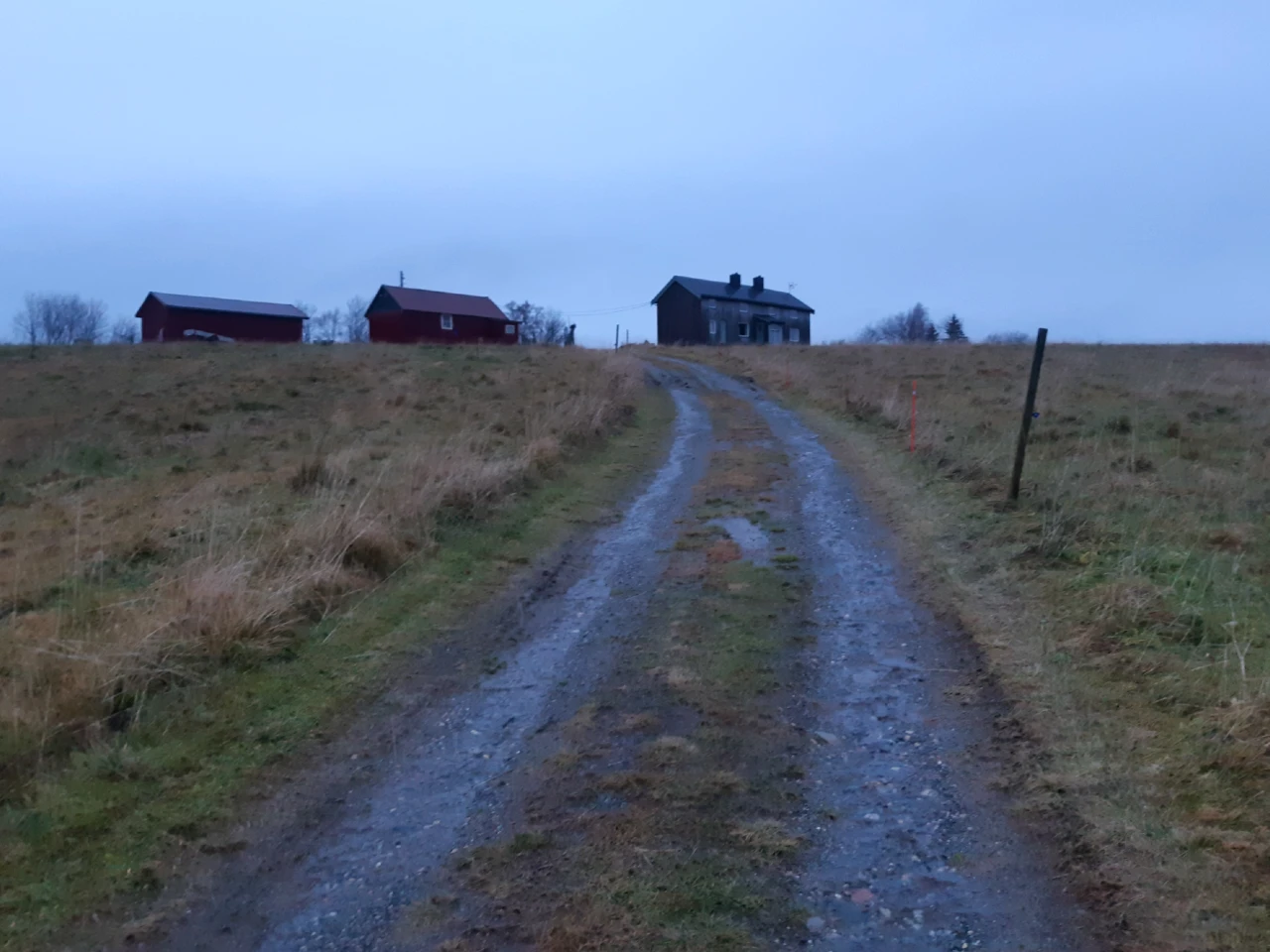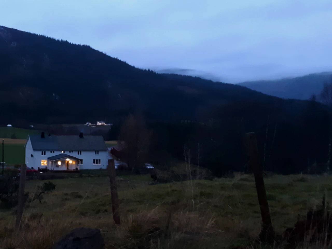 Mørket begynte for alvor å feste grepet. Fra Lagli var det grusvei videre nedover mot dalbunnen, og snart var jeg nede på fylkesvei 808. Plukket med meg sekken der jeg hadde satt den, på vei utover mot Austvika. Etter drøyt 6 km gange på asfalt var jeg framme ved bestemmelsesstedet – skytebanen. Hadde et håp om at grillhytta på stedet var til allmenn avbenyttelse, slik det er mange steder. Det var den tydeligvis ikke, da den var låst. Men jeg fant meg godt til rette under tak likevel – på standplass.