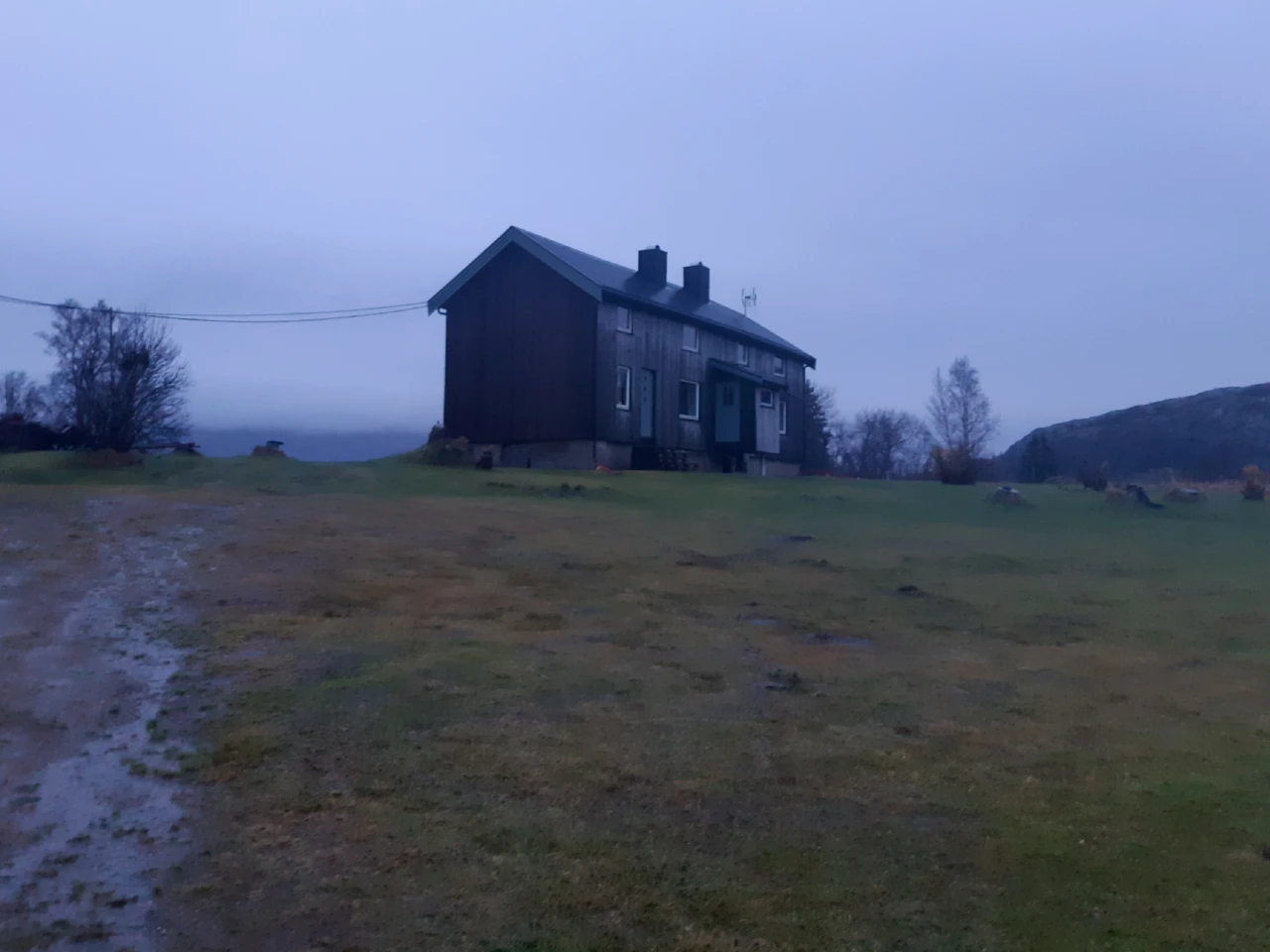 Den bekmørke natta forløp greit. Det var i grunnen litt koselig å sitte og høre høstregnet mens jeg selv satt godt beskyttet under tak med underholdning på mobilen. Klokka var sju på morgenen da jeg begynte å pakke, og en halvtime seinere sto jeg i veikanten og viftet med ei lykt.