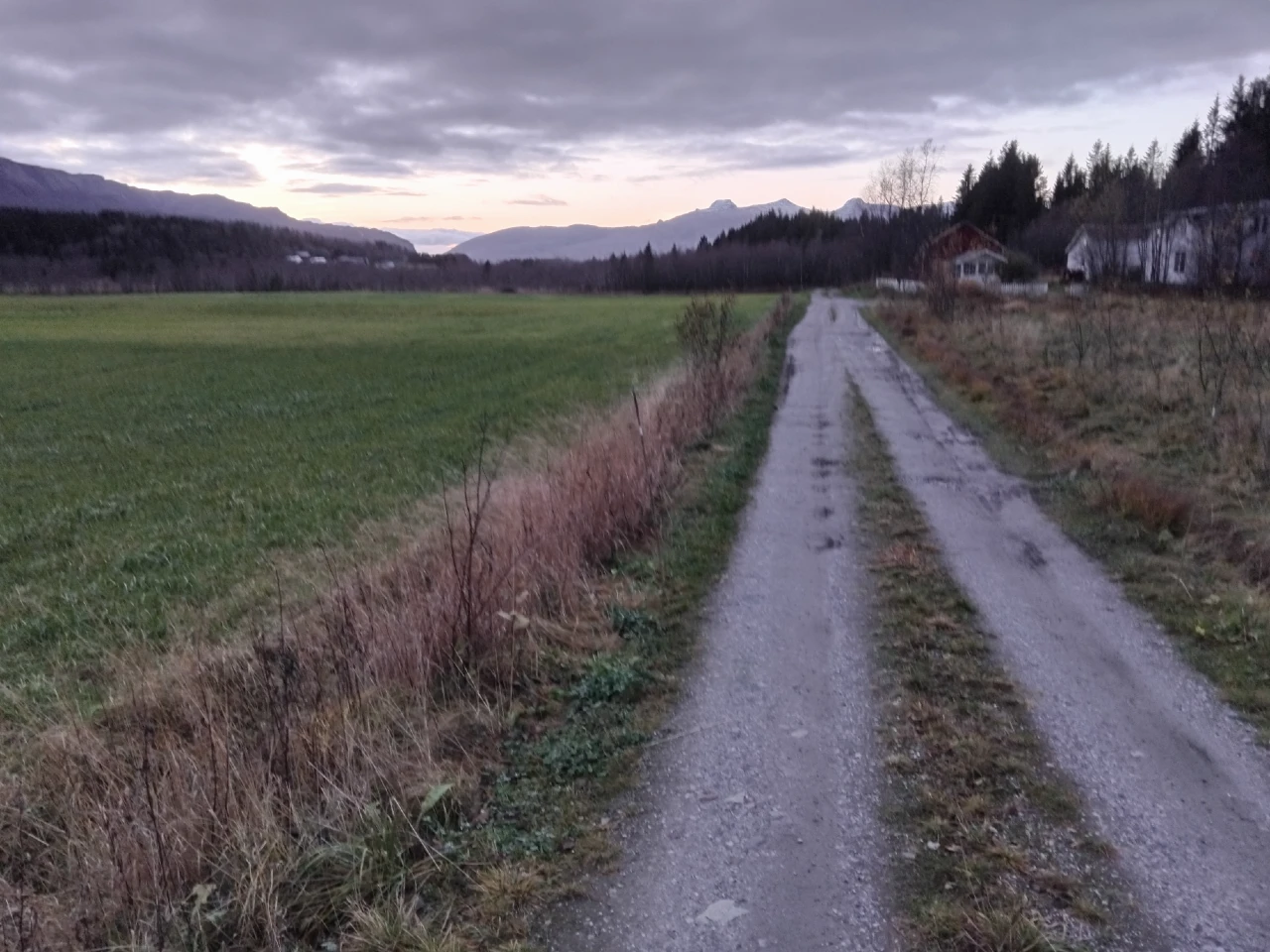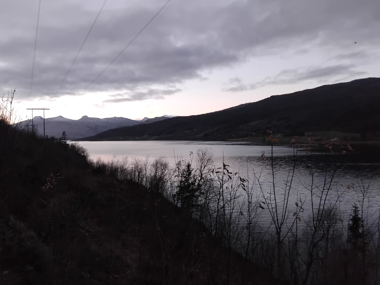 Fra grusveien dreier jeg mot fjorden, for så å følge kraftlinja.