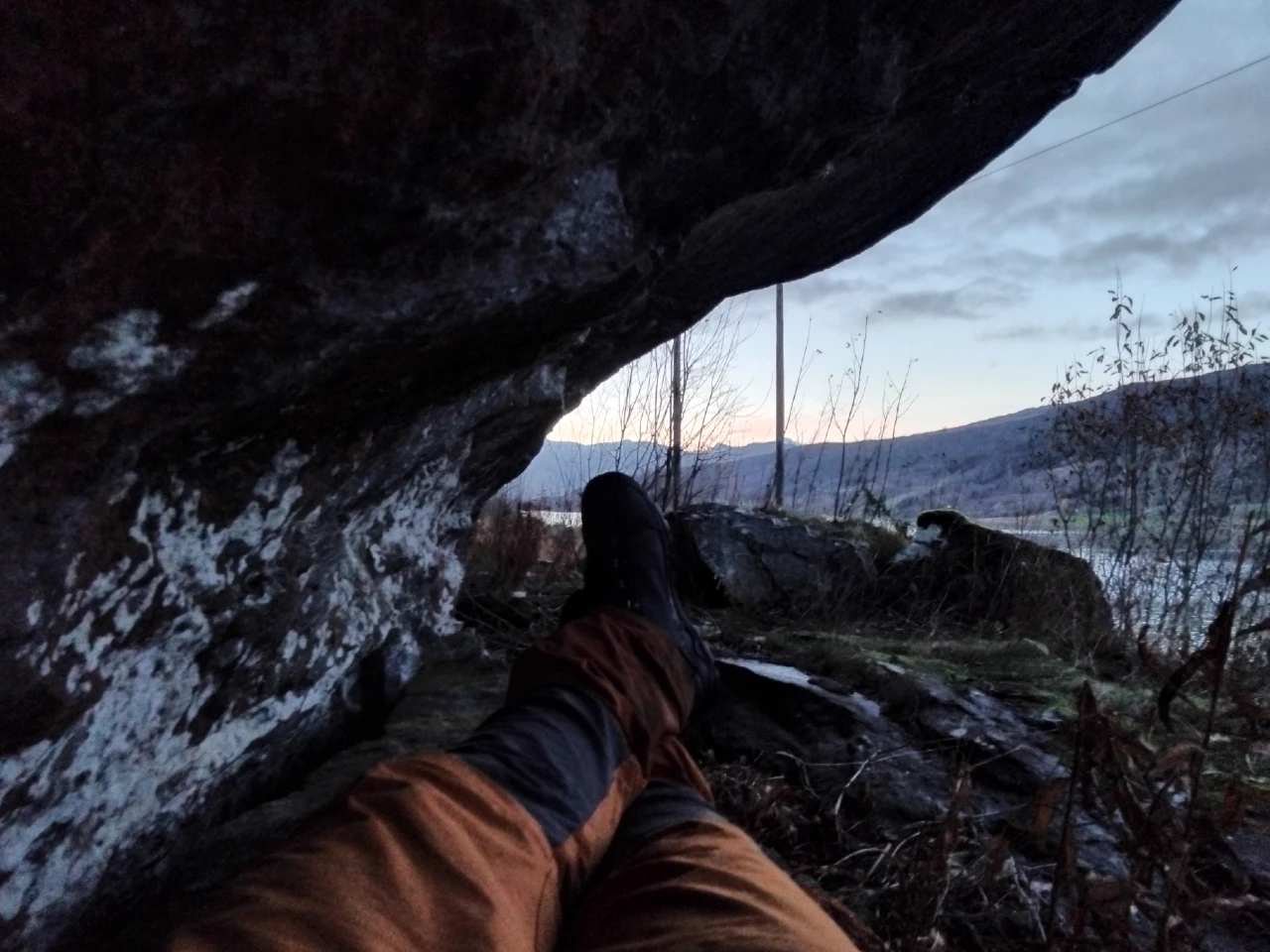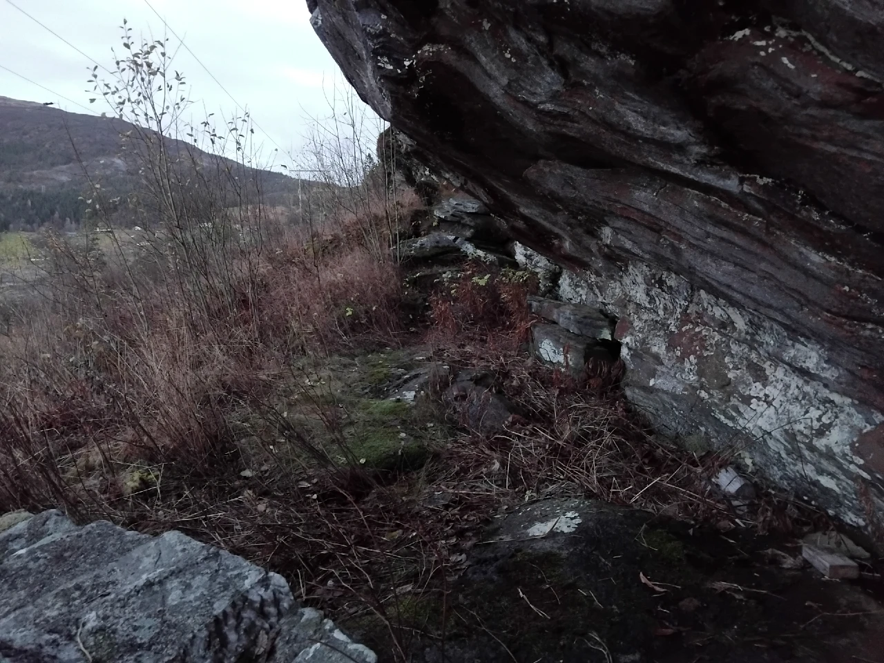 Jeg tok meg de få meterne oppover mot helleren, som er innfelt i en bratt, men ikke så høy bergvegg som går parallelt med berghylla nedenfor. Nøyaktig posisjon innhentes på kulturminnesøk.no. Inne i helleren, helt inn mot berget, fantes det et opphevet og nokså flatt parti – ei steinseng! For en luksus! La meg sporenstreks på rygg, og følte meg sikker på at også menneskene i steinalderen hadde dratt sin kos på nøyaktig samme sted. Her kunne de være i skjul for både vær og vind – og artsfrender, for den saks skyld.