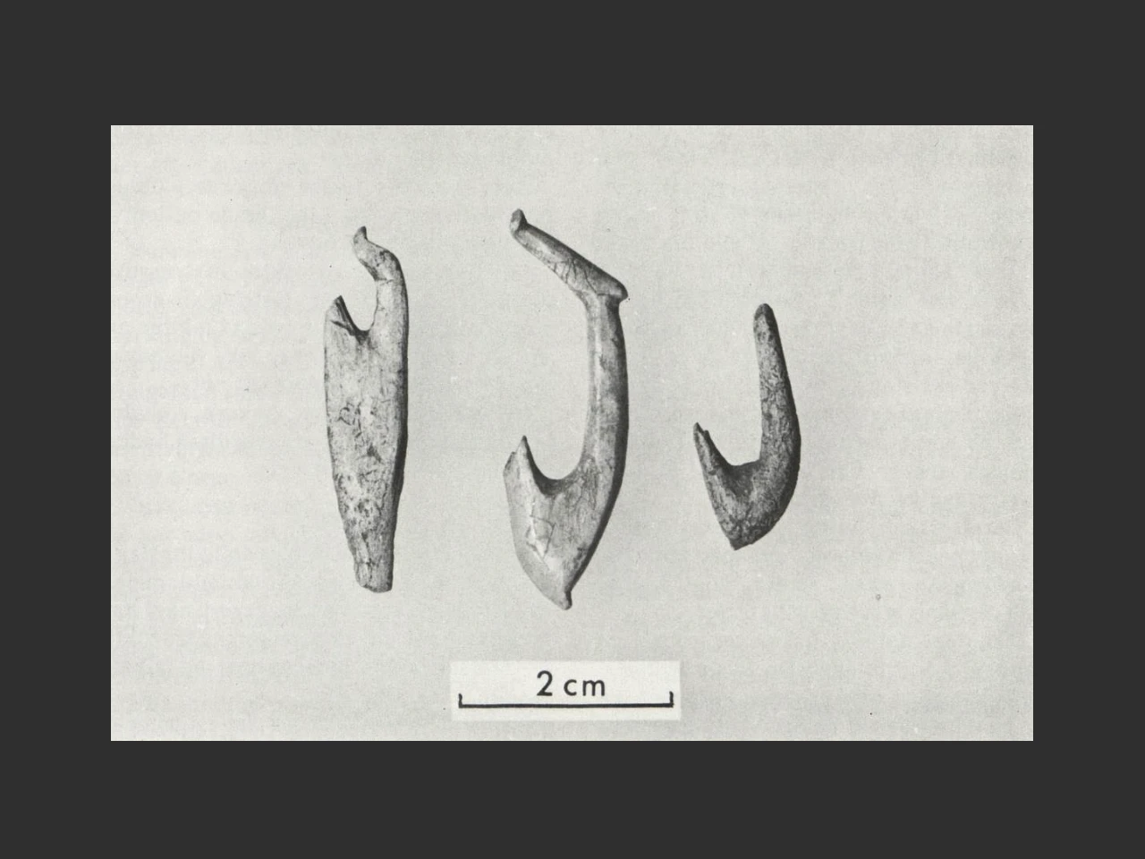 Funn av to fullkomne angler av bein, samt et ufullført eksemplar. (Bilde: Helgeland Historie, Bind 1.)