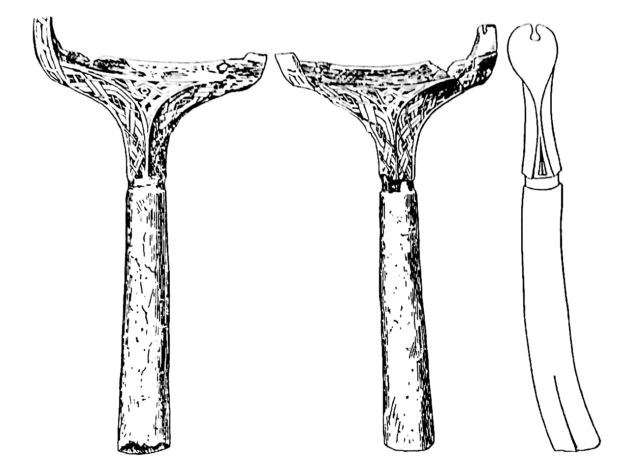Denne fint dekorerte runebommehammeren ble funnet i en heller i 1915. (Illustr.: Helgeland Historie, Bind 1.)